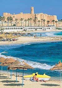 ТУНИС -- парадоксальный, перевернутый мир. Монастир, Сусс, Хаммамет, Махдия -- эти сказочные названия, вызывающие в памяти гриновские города Лисс и Зурбаган! Море и пустыня, сорокаградусная жара и прохладный бриз. Пыльные кривые улочки старого города -- медины -- выводят вас к побережью. Там, под пышными веерами пальм, плещется море -- шелково-зеленое, как знамя Аллаха, затканное золотыми нитями солнца. Оно мелкое и теплое.