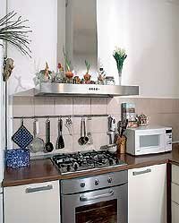 × Максимально освободите в кухне верхнюю зону за счет нижней. Откажитесь от многочисленных навесных ящиков, загромождающих пространство. Достаточно будет нескольких полок-витрин с матовыми стеклянными дверцами, как бы парящих в воздухе.